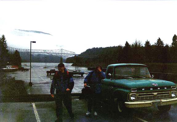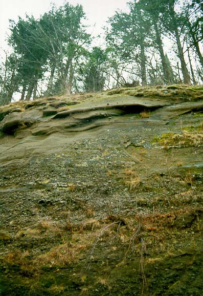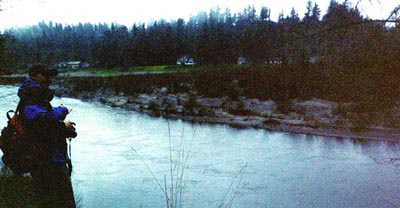 There was a house here at one time. Behind us back across the street, we were able to see a very distinct gully. Down this distinct gully of which there was water eroding it, there came a mudslide, and it took the house into the Sandy river. The mudslide was very liquid, very fast moving, and it undermined the house. Word has it that the old man living there was rescued atop his house as it floated down the Columbia River. His wife was never found. Having a house on a cut bank is definitely a very dangerous desicion. If you have a house on a cutbank, you can be gauranteed that at sometime the land under your house will go away, even if its not neccesarily on a cutbank |