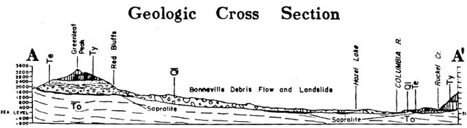 Looking across the river and a bit to the west from Cascade Locks, we saw a mound of material that was deposited by an enormous landslide, that being the Bonneville Landslide. The source of the Bonneville Landslide was Red Bluff, which is located just sou th of Greenleaf Peak north of the Columbia River in Washington state.