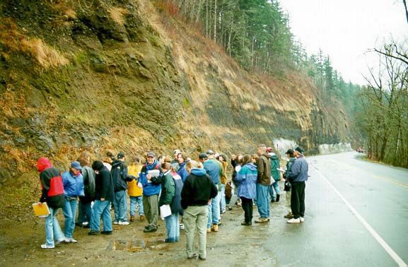 The area of the Bonneville Landslide is slightly tilting south towards the river. In this area you mostly have basalt which is to a certain extent jointed and fractured. This basalt overrides what is called the Ohanapecosh Formation. The Ohanapechosh Fo rmation happens to be a formation that has been weathered and altered now into slipery red clays. When you weather and alter into slippery red clays you have basalts that have fractured on top of the clays that are tilted south towards the river. When wa ter gets involved with this area of basalts on top of the clays it becomes the perfect place for a mass wasting event because of the slick and slippery clays coupled with the fact that they are tilting downward towards the Columbia River. At this point Daina again went into a Native American story this time dealing with the Kilikat tribe and the Multnomahs. As the story goes, there was a "bridge" that was created over the Columbia River that connected what is now Washington to what is now Oregon, with the Multnomahs on the south side of the river and the Kilikitats on the north side. As history shows, this "bridge" was actually a blockage of the Culombia