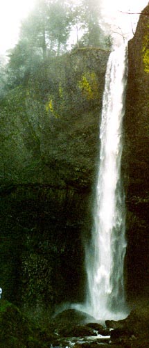 Another noticable feature in this area is there is a slight dip in the flow, going down on one side of the waterfall and then up the other side, resembling a valley. One of the theories for the formation of this area is that this is also an intercanyon fl ow. Because of the nice valley shape that this area has, flows most likely filled this up, and you have columnar jointing in this area not at a vertically straight formation, but more at an angle where it has flowed in the erosion-forming v-shape carved by the river. What you can also see here is how a waterfall is being created. Where the waterfall is cutting back, in the cracks of the columnar jointing, water will collect, freeze, and expand resulting in the lower section craking and breaking off. This is refered to as frost wedging. At the top of the flow it is not columnar jointed, rather it is brick-brack jointed. The part of the flow that is brick-brack jointed doesn't have the nice, long cracks that the columnar jointed section does, meaning that there is significantly less fros t wedging taking place and as a result the brick-brack jointed portion sustains much less erosion. Another thing to point out is that it is always easier to erode between flows than in the middle of a flow. When a stream and a waterfall are in the area, it will erode inbetween flows causing them to "step-out." Most of the streams in this area such as Multnomah Falls have steps to them which are present because the fall will erode the top of one flow unit and the bottom of another flow unit at a faster rate than the middle of the flow units, leaving sometimes numerous steps that the waterfall then des ends down upon. On the way back to the parking lot we stopped along the side of the trail to examine an exposed part of the flows. The first unit we looked at was a 25 million year-old formation, which tends to be more andisitic than basaltic, and is part of the origina l building of the Western Cascades. You are able to see the difference in age between this flow and the Columbia River basalts. The Columbia River basalts were erupted 15 to 16 million years ago. There are 3 different types of Columbia River basalts ex posed here at Latourell Falls, those being the Grand Ronde basalts, the Frenchman Springs flow, and the Priest Rapids flow. The Frenchman Springs flow and the Priest Rapids flow of the Wanapum Basalts are where the upper falls are, meaning that they are significantly younger (about 14 million years old) as opposed to 15 or 16 million years old which the base of Latourell Falls is made up of. |