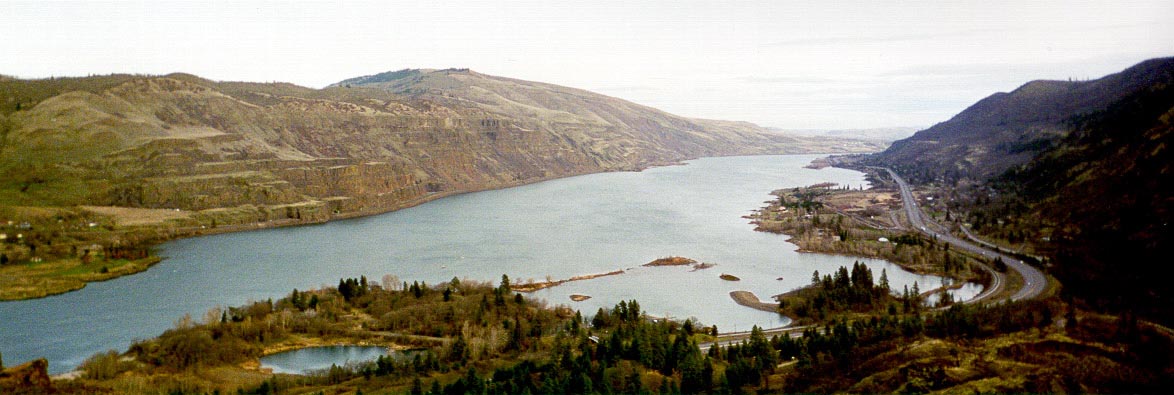 Our last stop on the trip was at the Rowena Crest Overlook up above and across the river from the town of Lyle, Washington. From our vantage point on the overlook, you can see a mass of material that has jetted out into the Columbia River, and this is ye