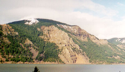 Across the Columbia River to the north from Starvation Creek you are able to see a nice example of a dipping block right into the river. The picture to the left illustrates how this anticline is dipping into the Columbia River. The dip on this section is about 35 to 40 degrees with the strike being perpendicular to that. This is not a true dip though, because it is not on end to the angle. This would be considered and apparant dip (meaning you would say this has an apparant dip of about 35 degrees to t he southeast). |